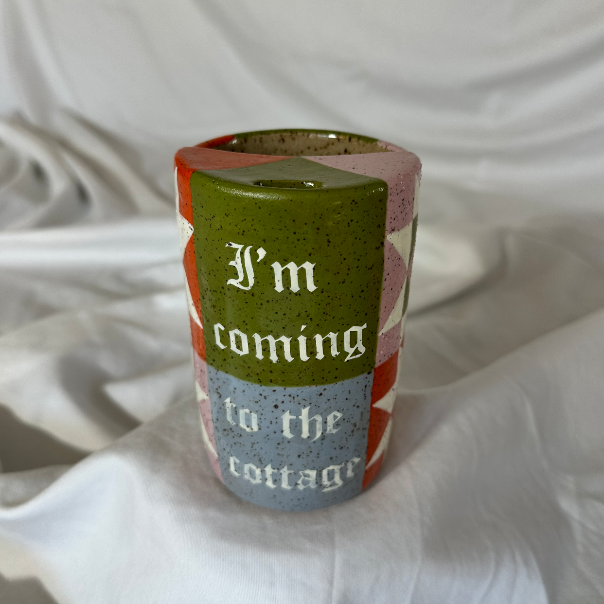 Handmade, hand painted, high quality, low maintenance, food safe. Holds 12oz. of liquid. Inspired by the TV show Heated Rivalry with quilt pattern.